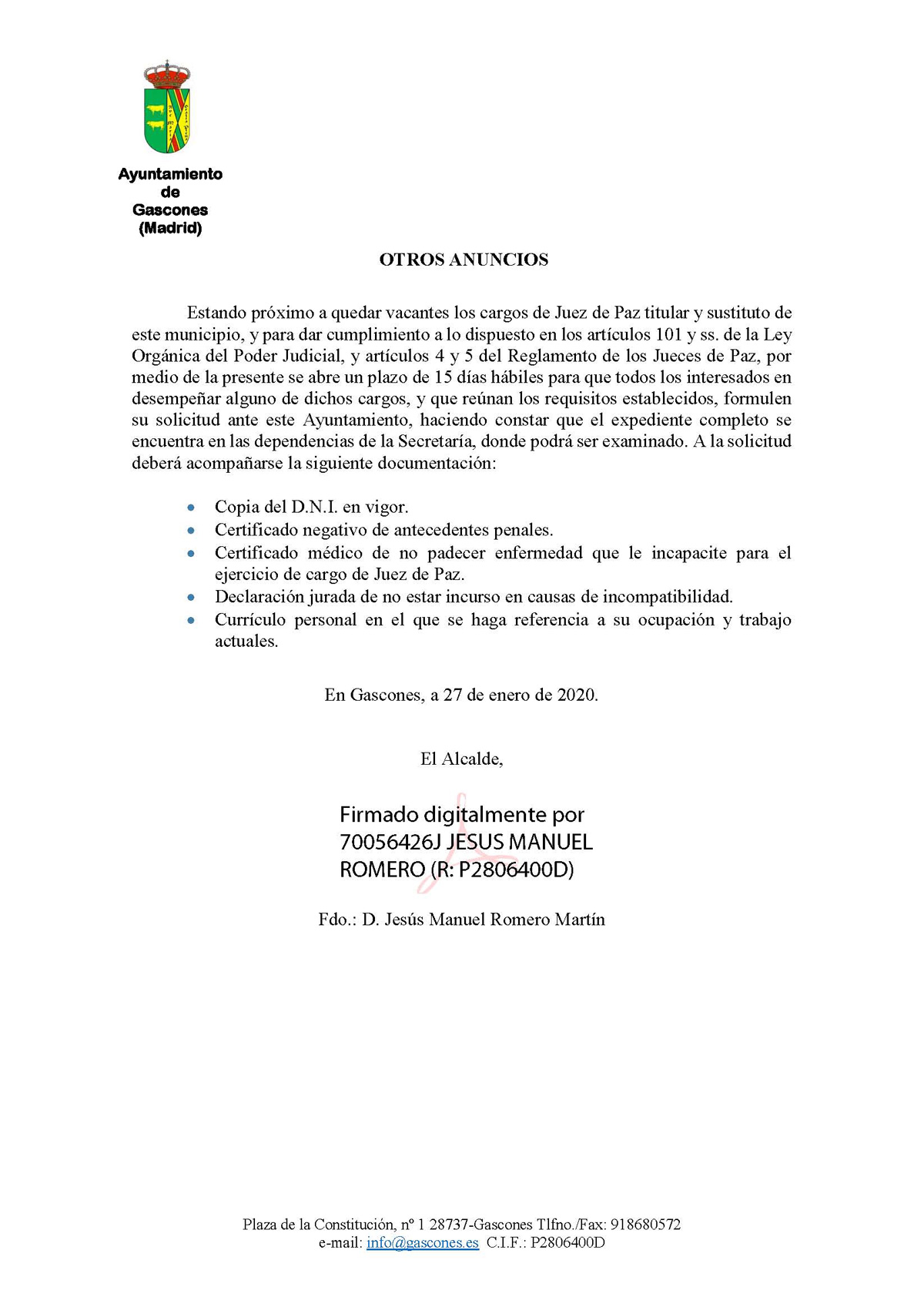 Tablón Municipal Tablón Municipal 30 Enero 2020 Visto: 1497 Próximamente quedarán vacantes los cargos de Juez de Paz titular y Juez de Paz sustituto ++Declaración responsable - Solicitud tweet